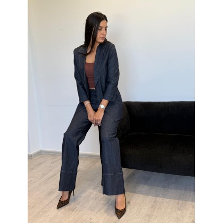 Conçu dans un jean de qualité, cet ensemble allie confort et modernité. La veste au col tailleur apporte une touche chic et affirmée, tandis que le pantalon coupe droite allonge la silhouette avec élégance.